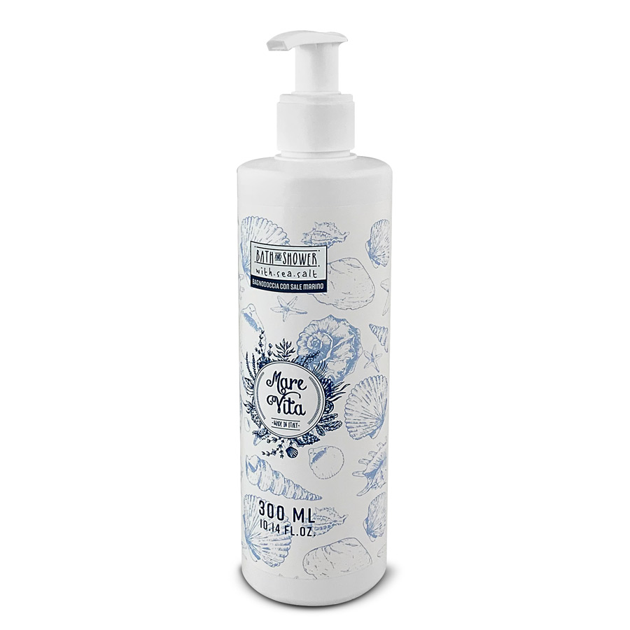 Δοσομετρητής ξενοδοχείου 300 ml που περιέχει αφρόλουτρο. Μοναδικό προϊόν για μαλλιά, σώμα, χέρια. Καλλυντικό ξενοδοχείου εμπλουτισμένο με θαλασσινό αλάτι. Καλλυντικό με καθαριστική και απολυμαντική δράση. Μοντέρνο λευκό πλαστικό μπουκάλι απαλή αφή με πλευρική ταινία για έλεγχο της στάθμης του προϊόντος.