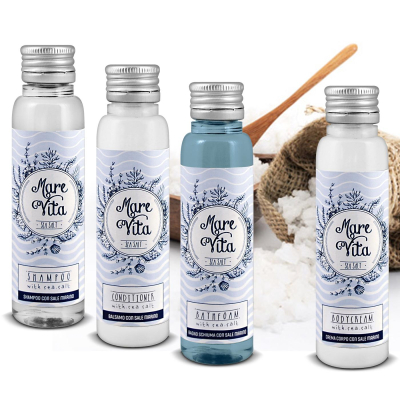 Balsam 32 ml vial – Pack 308 pcs.conditioner enriched with sea salt, ideal for detangling and giving natural structure to the hair. Cosmetic with a purifying and disinfecting action. Elongated vial with silver screw cap. Lively and elegant packaging with blue and azure details inspired by the sea. Aluminium cap with tear-off opening (guarantee seal)