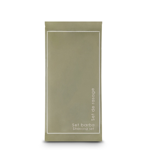 Σετ ξυρίσματος συσκευασμένο σε σφραγισμένο φακελάκι χάρτινης συσκευασίας flow pack. Ξυράφι και κρέμα ξυρίσματος μιας χρήσης με εκχυλίσματα αλόης βέρα .